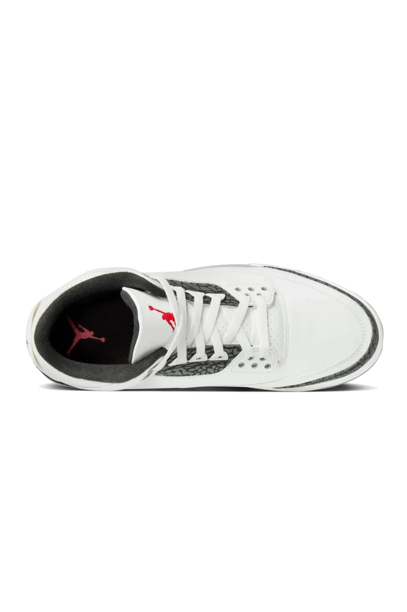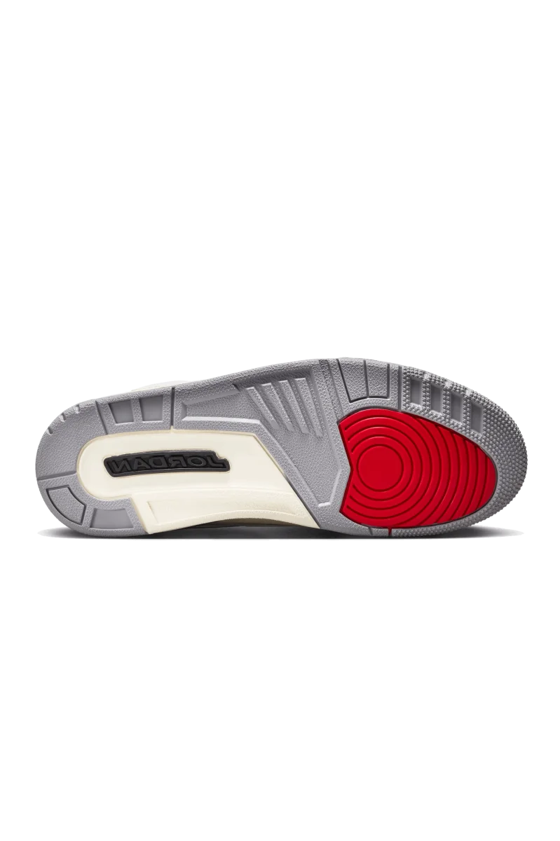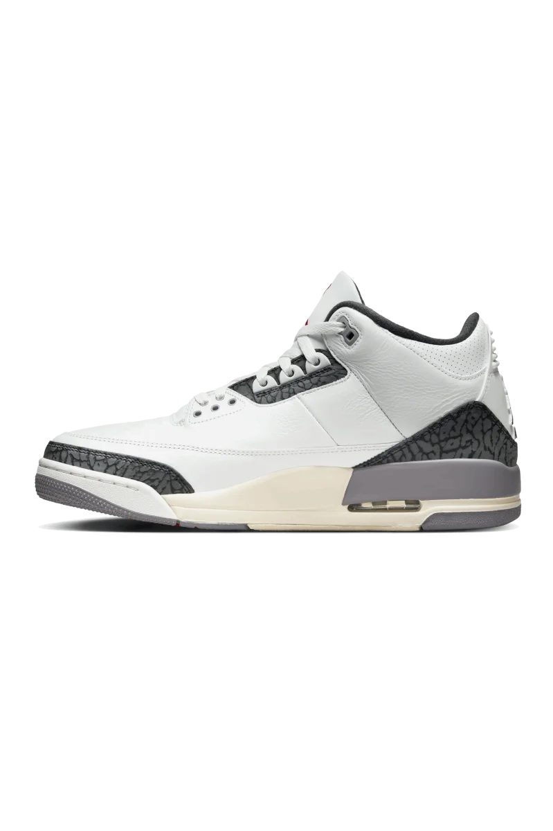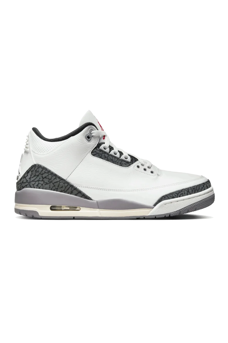 Questa Air Jordan 3, caratterizzata da una base in pelle martellata bianca, รจ caratterizzata da vivaci inserti rosso fuoco sugli iconici loghi Jumpman che decorano la linguette, mentre il nero ricopre la linguette del tallone. Il โCement Grey%E2%80%9D caratterizza gli occhielli, la fodera interna e parte della suola. Completa il design un’intersuola bianca con unitร Air visibili, il tutto appoggiato su una suola in gomma grigia. La combinazione di colori e texture crea una sneaker accattivante, che rende omaggio all’iconica silhouette Air Jordan 3.