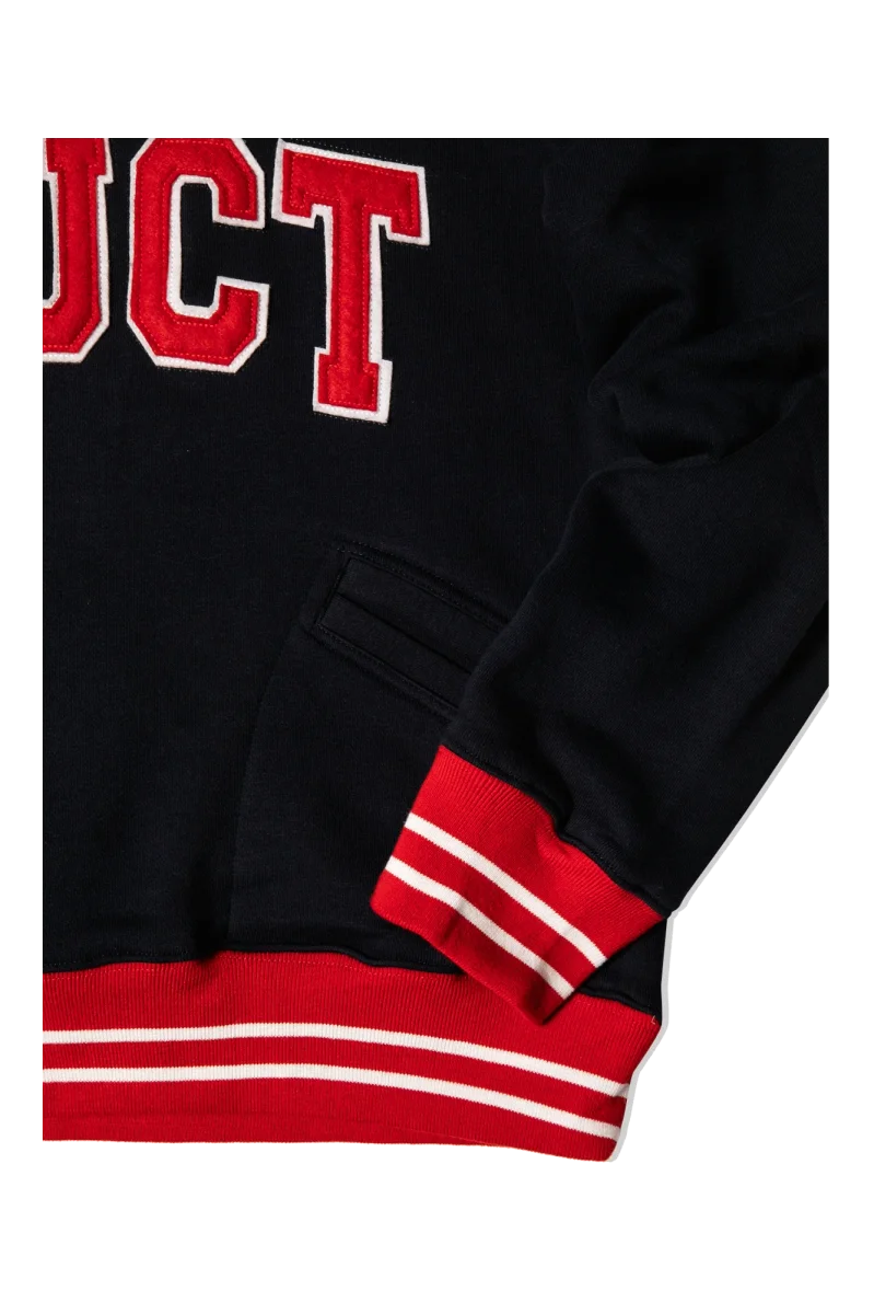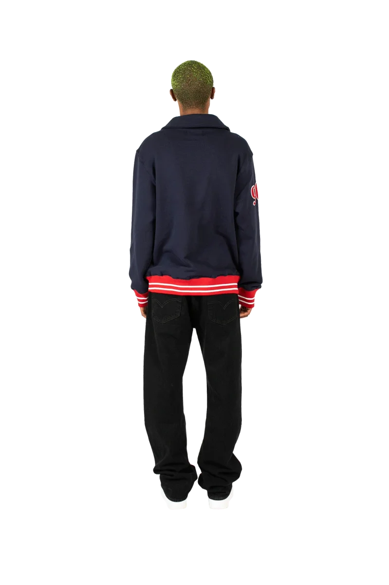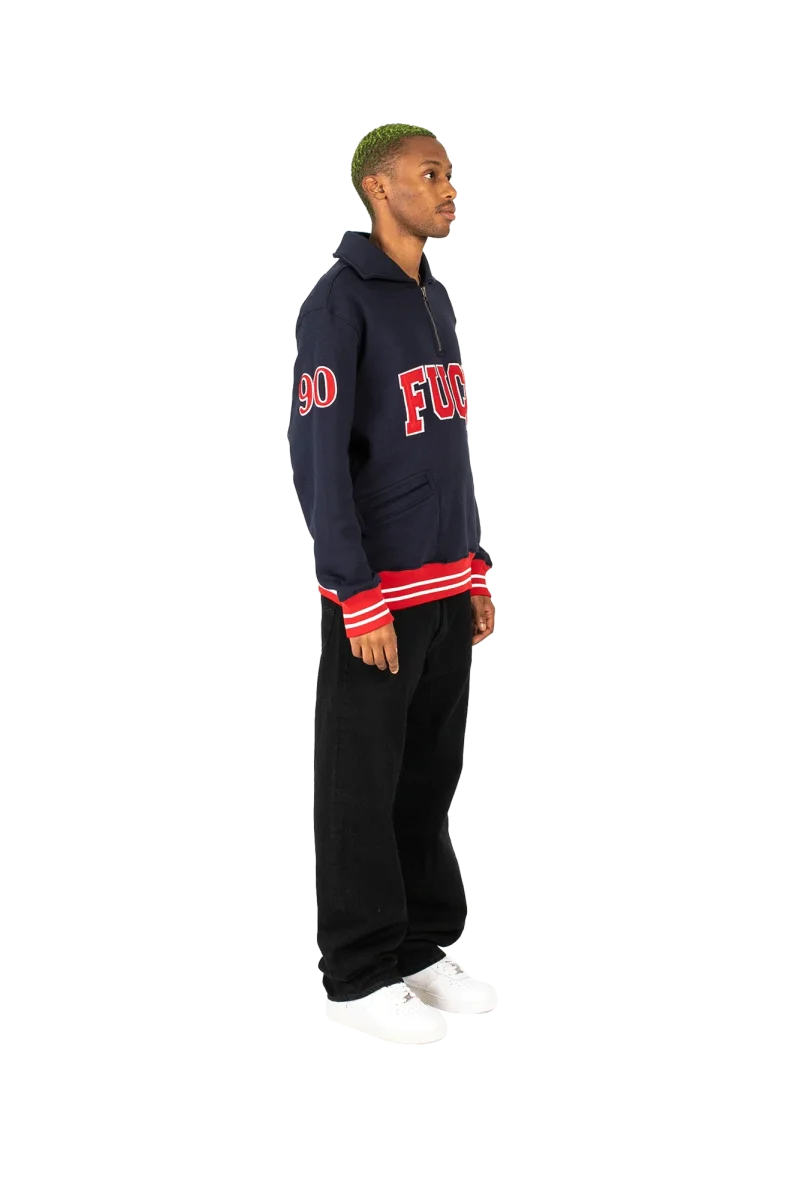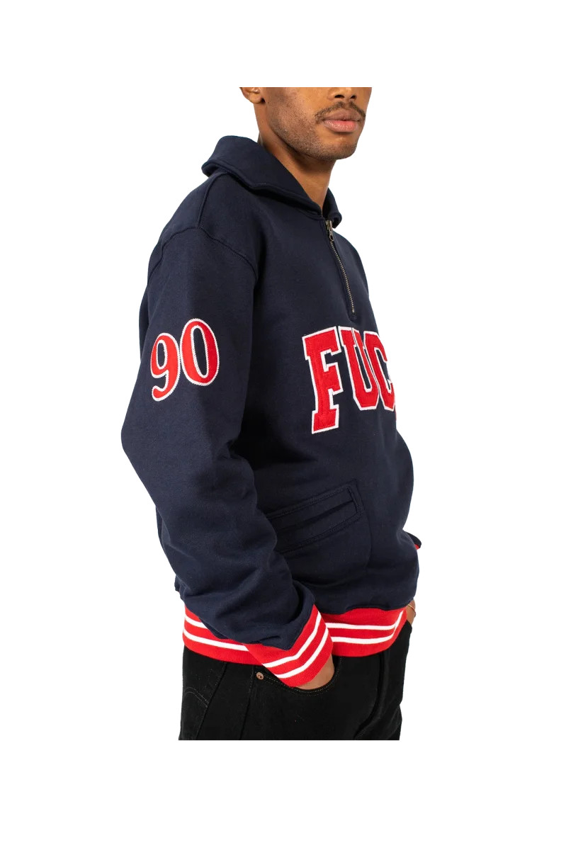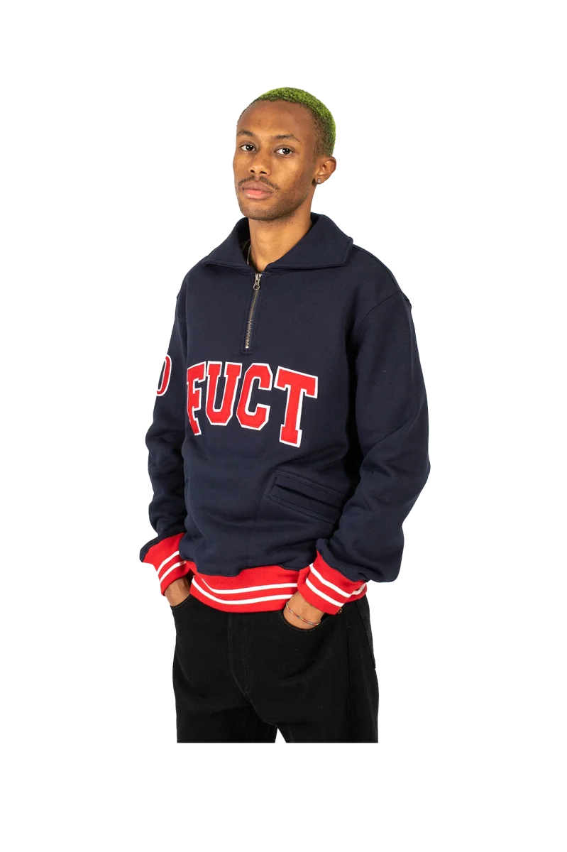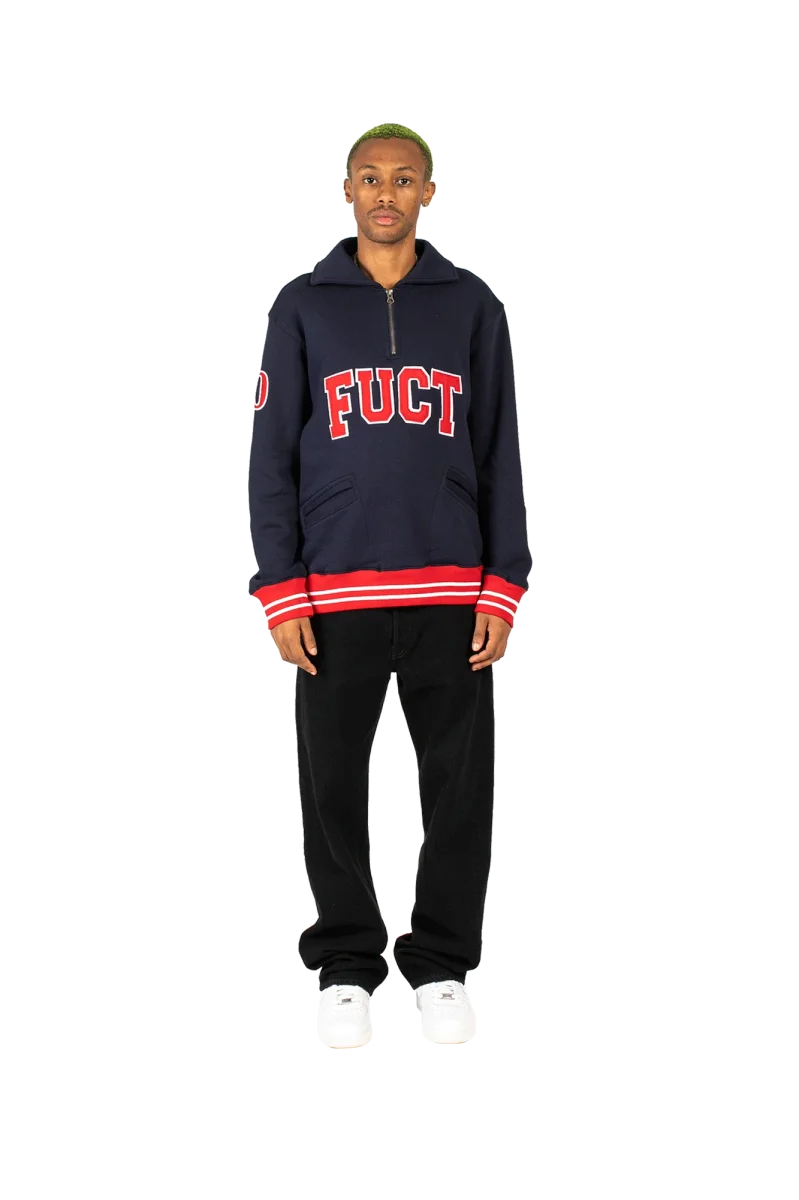 This navy blue sweatshirt features an over fit, cuffs and waist in contrasting red and white stripes, the Academy-style Fuct logo in red with white trims embroidered on the chest, a zip from the chest up towards the high collar of the sweatshirt, two pockets on the belly and the number 90 sewn with the same colors as the logo on the right sleeve. Fuct, standing for “Friends U Canโt Trust,” is a streetwear brand founded in Los Angeles by Erik Brunetti and Natas Kaupas. Pronounced “fuck*d,%E2%80%9D the brand uses controversial graphics concerning both political and religious themes. Even today, after three decades of existence, itโs still considered a cult brand in the streetwear scene.
