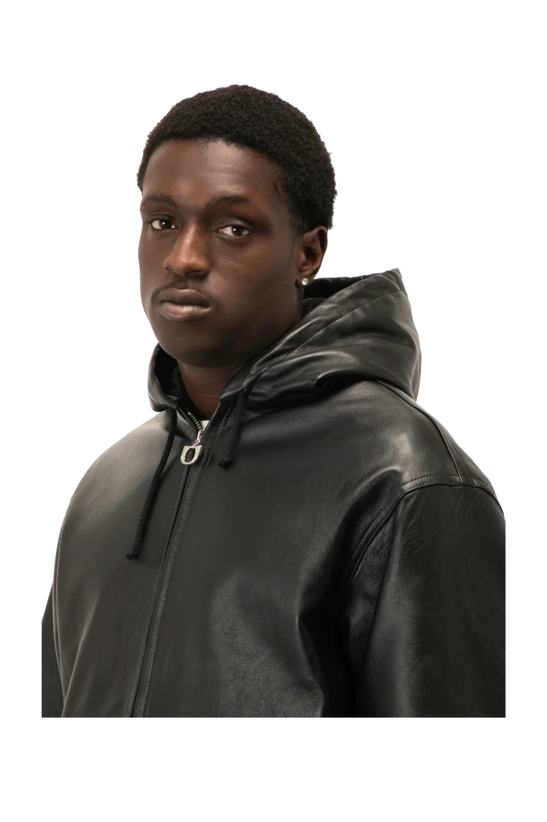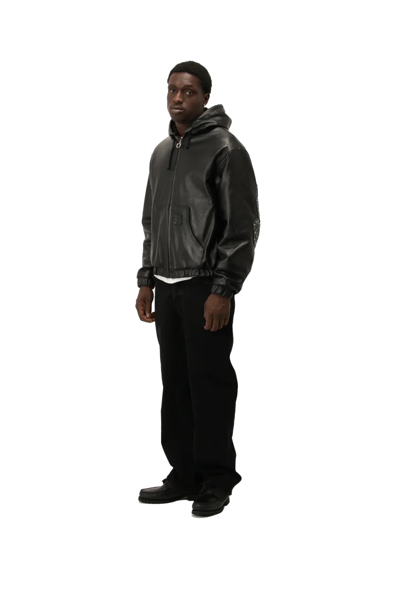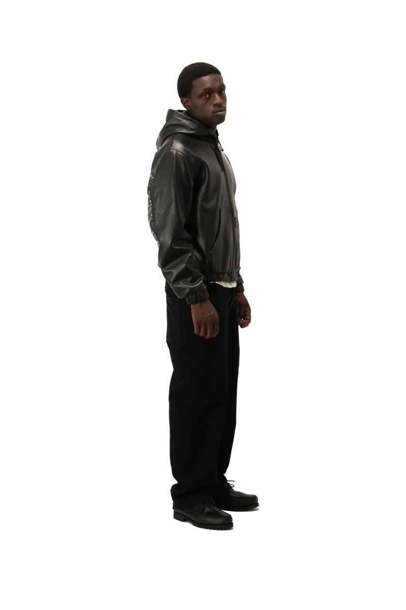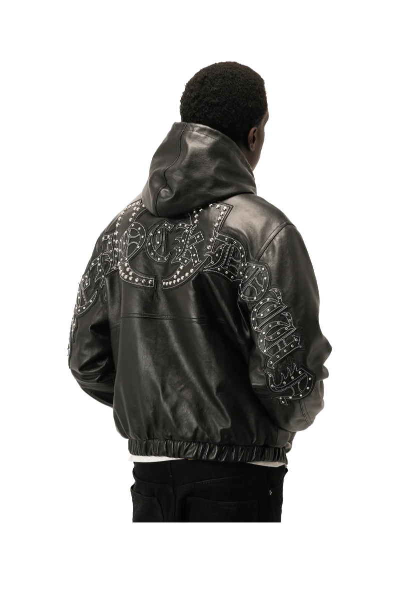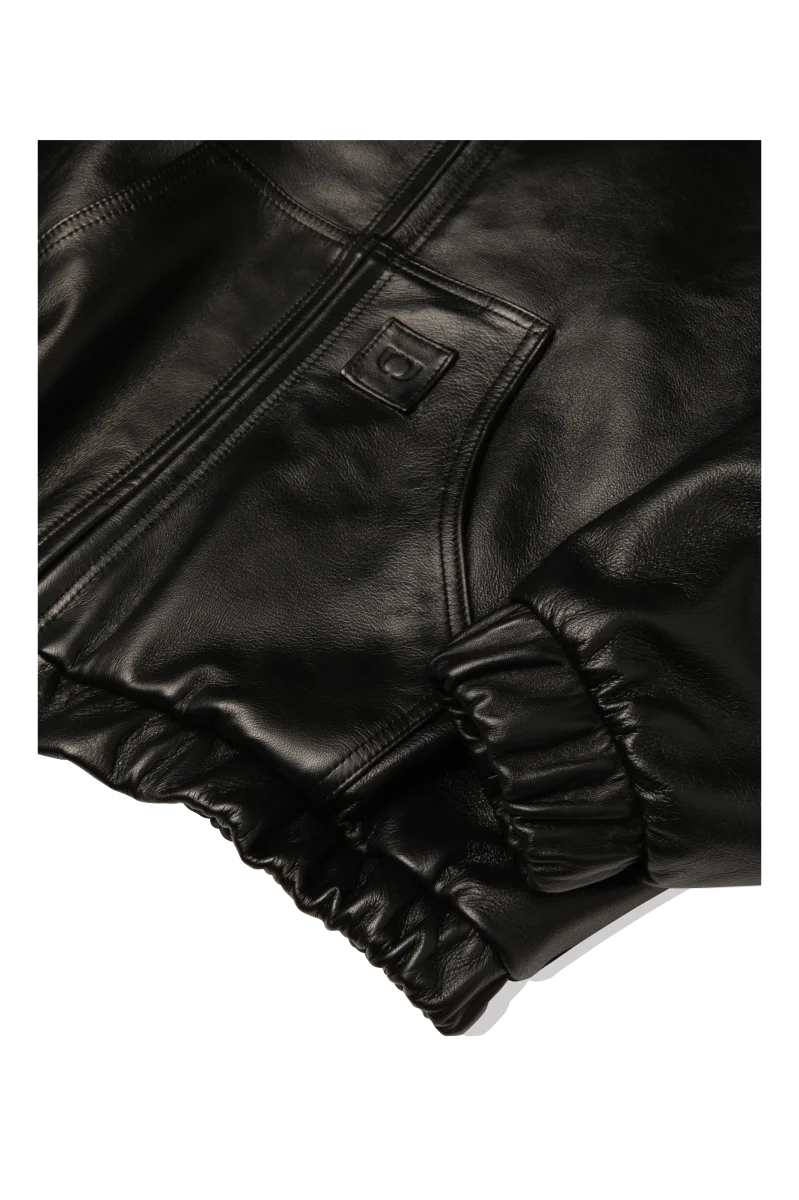 Questo bomber in pelle nera, realizzato in Italia con materiali di alta qualitร , presenta una vestibilitร regolare ed รจ dotato di imbottitura interna e patch borchiato “One Block Down” su schiena e maniche.