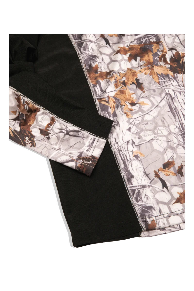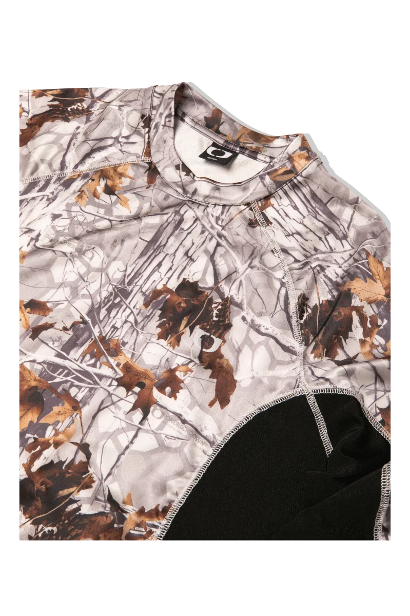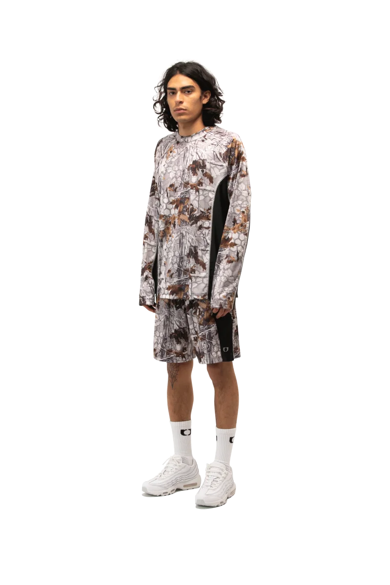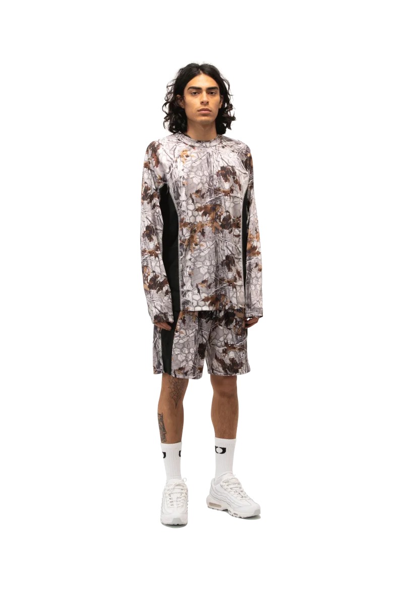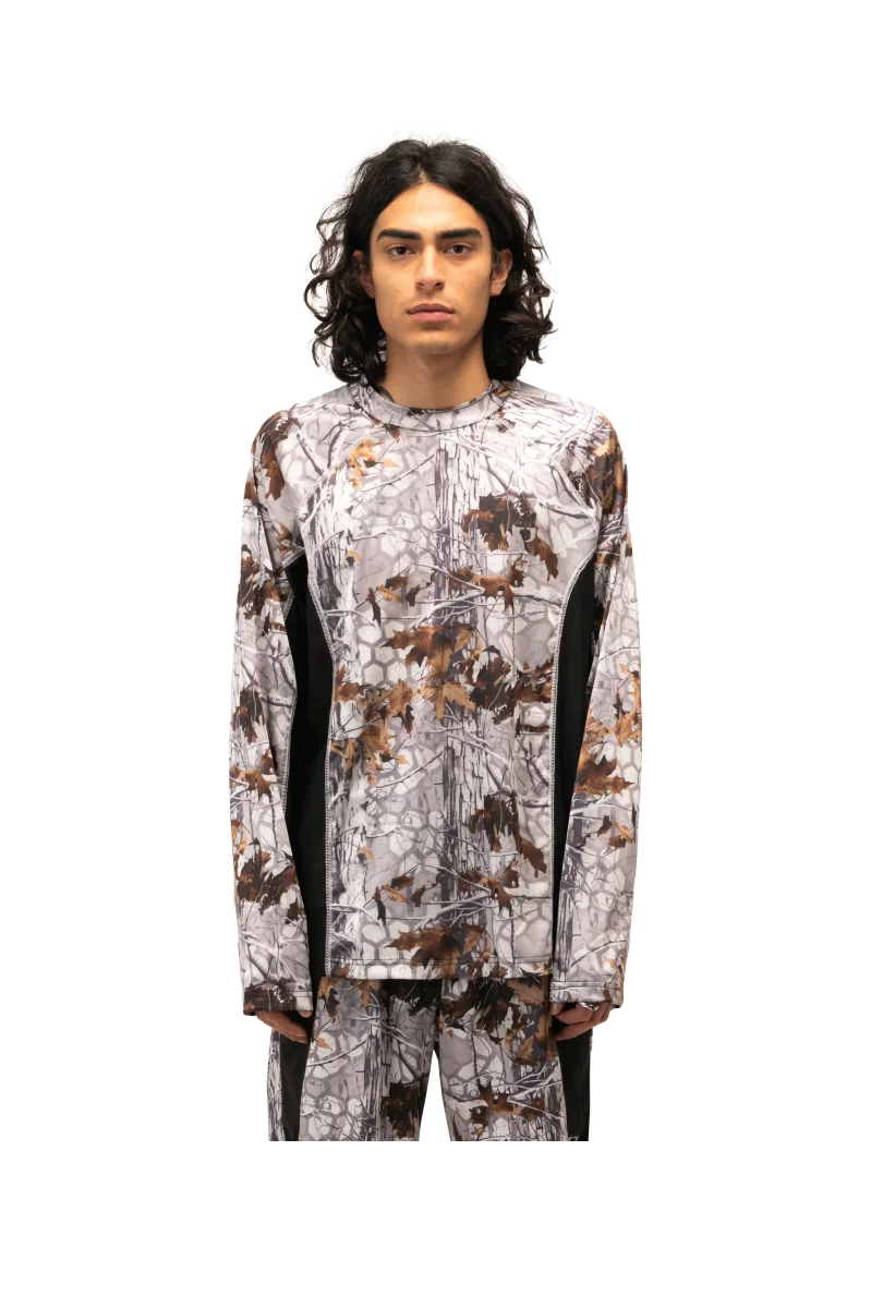 Questa maglietta tecnica a maniche lunghe รจ realizzata in tessuto elasticizzato e presenta una stampa camouflage e inserti a contrasto.