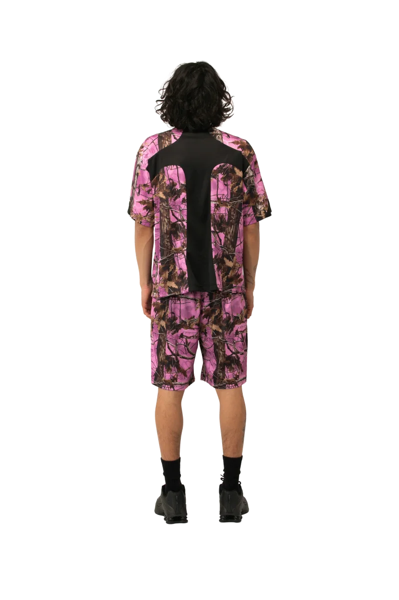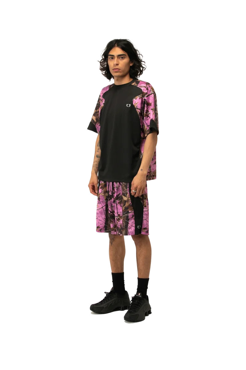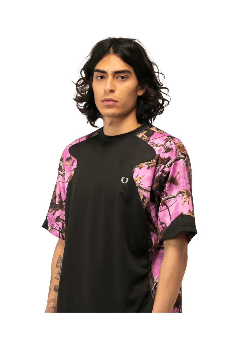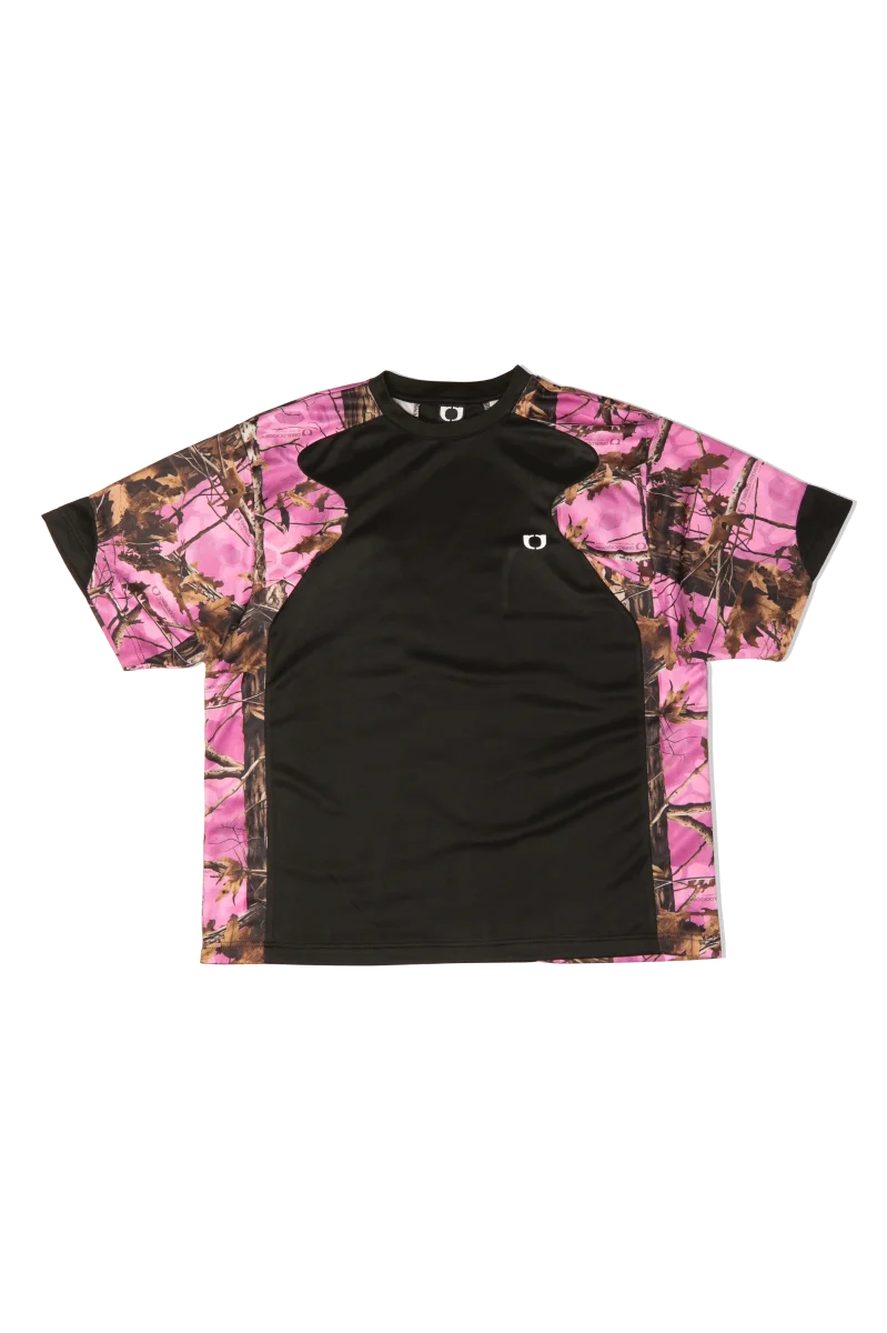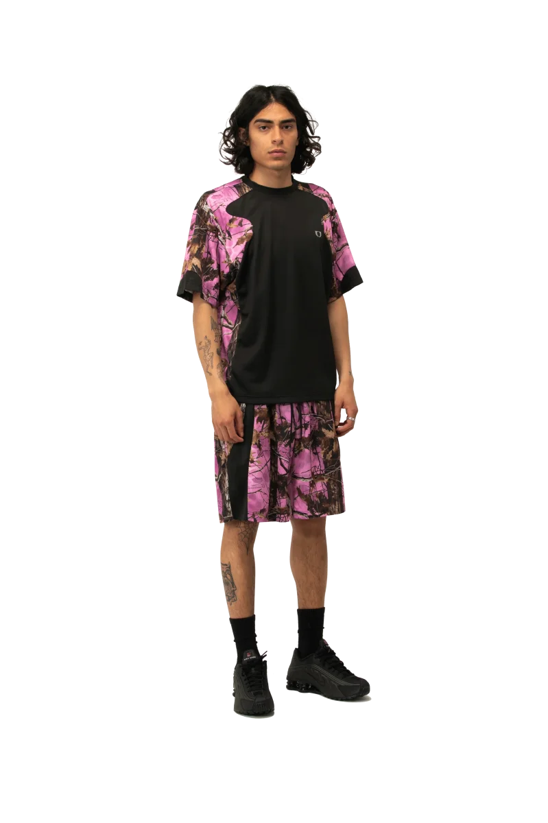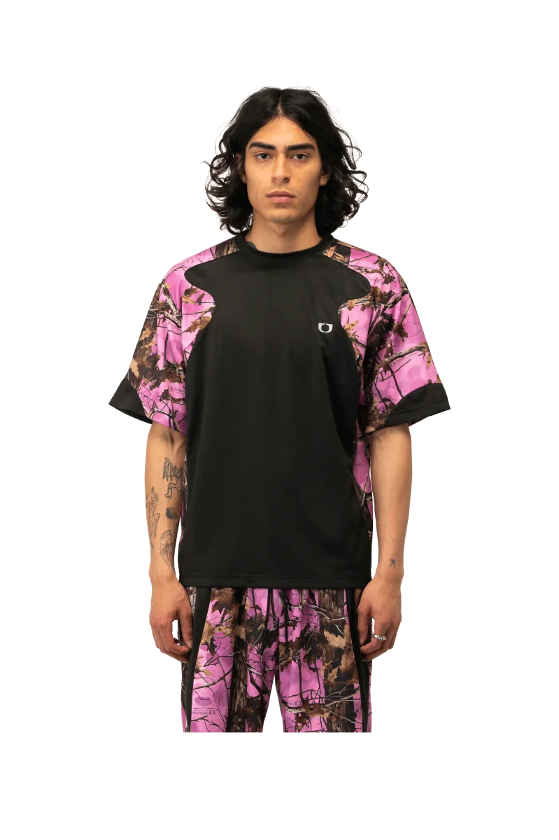 Questa t-shirt sportiva a maniche corte presenta una stampa camouflage e inserti a contrasto.