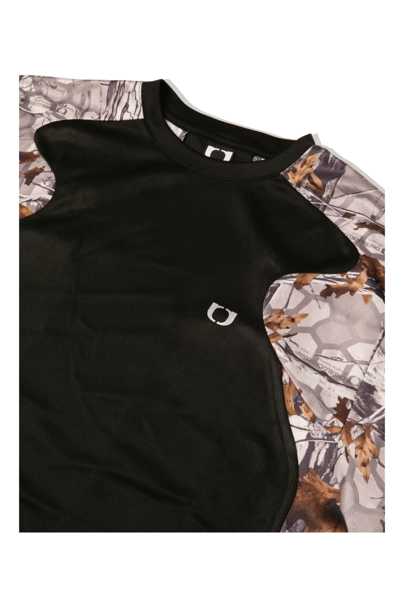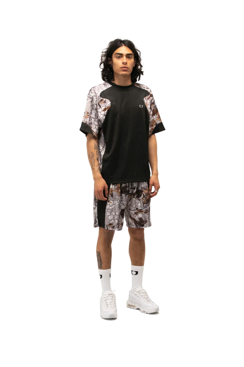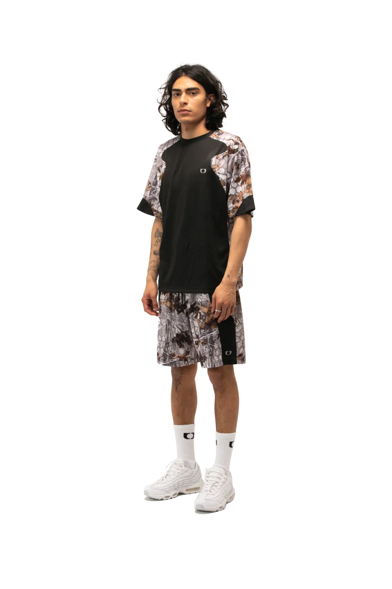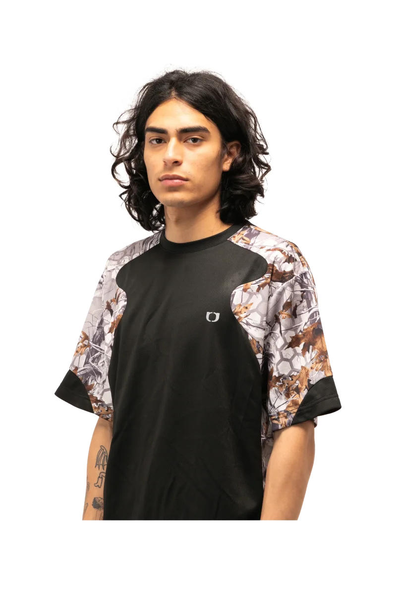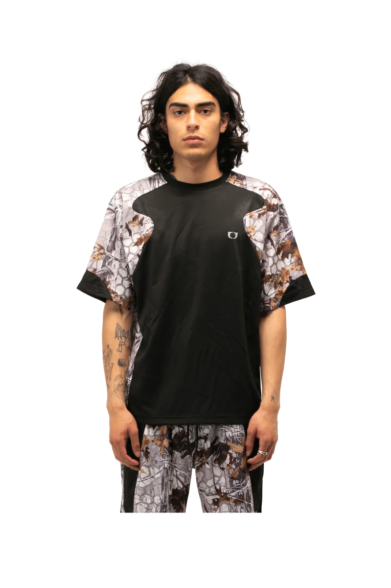 Questa t-shirt sportiva a maniche corte presenta una stampa camouflage e inserti a contrasto.