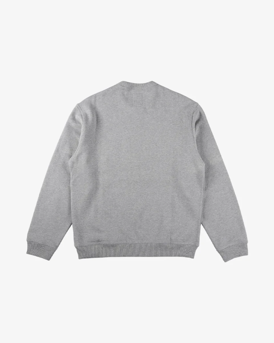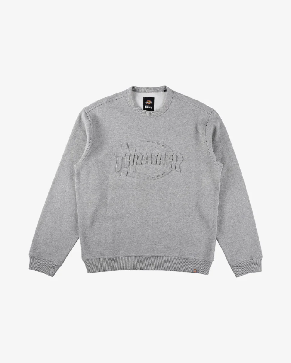 Dickies x Thrasher Logo Crew Grey Melange; 80% cotone, 20% poliestere; collo, polsini e orlo elastici a costine; logo Dickies x Thrasher in rilievo; relaxed fit.