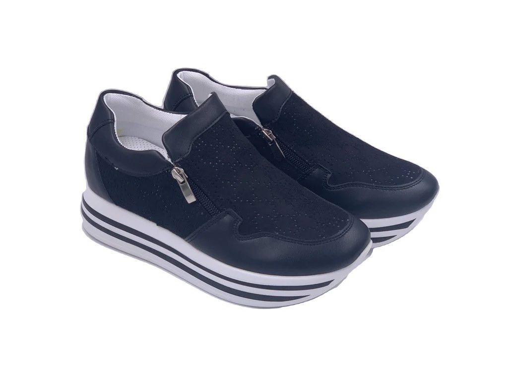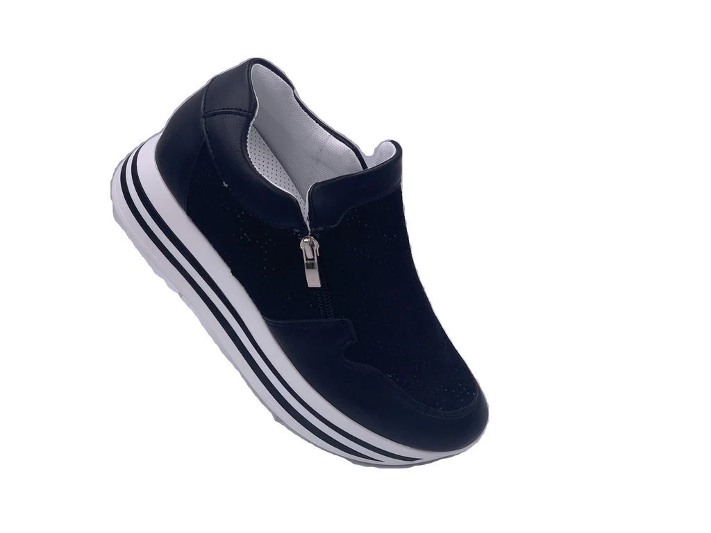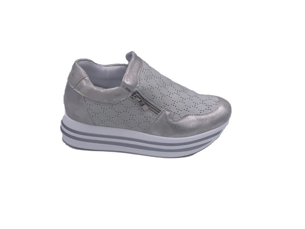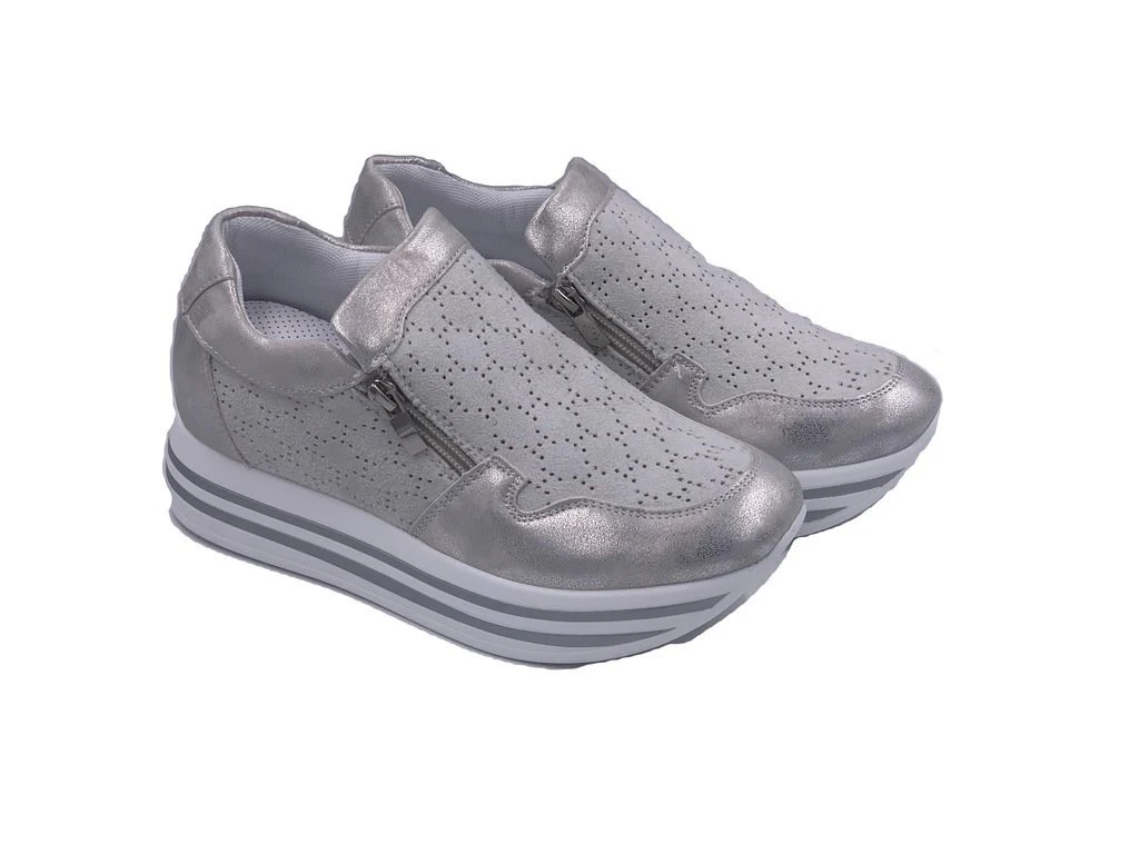 Energy Hight sneakers. Una sneakers da donna con zeppa 4cm, scarpa in camoscio e pelle. Tomaia con dettagli forati sulla parte anteriore e sui pannelli laterali. Chiusura con doppia zip esterna ed interna. Sneakers ideale per outfit sportivi ed adatti a tutti i giorni. Plantare interno in vera pelle. Disponibile in nero e argento.