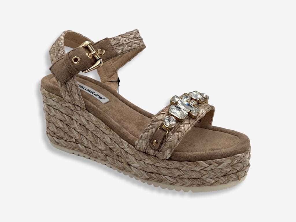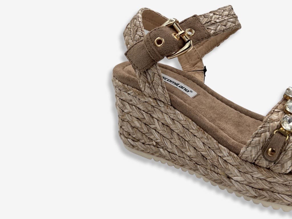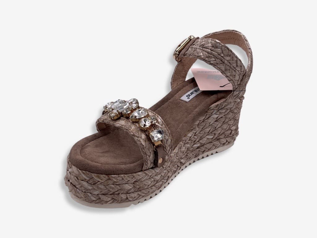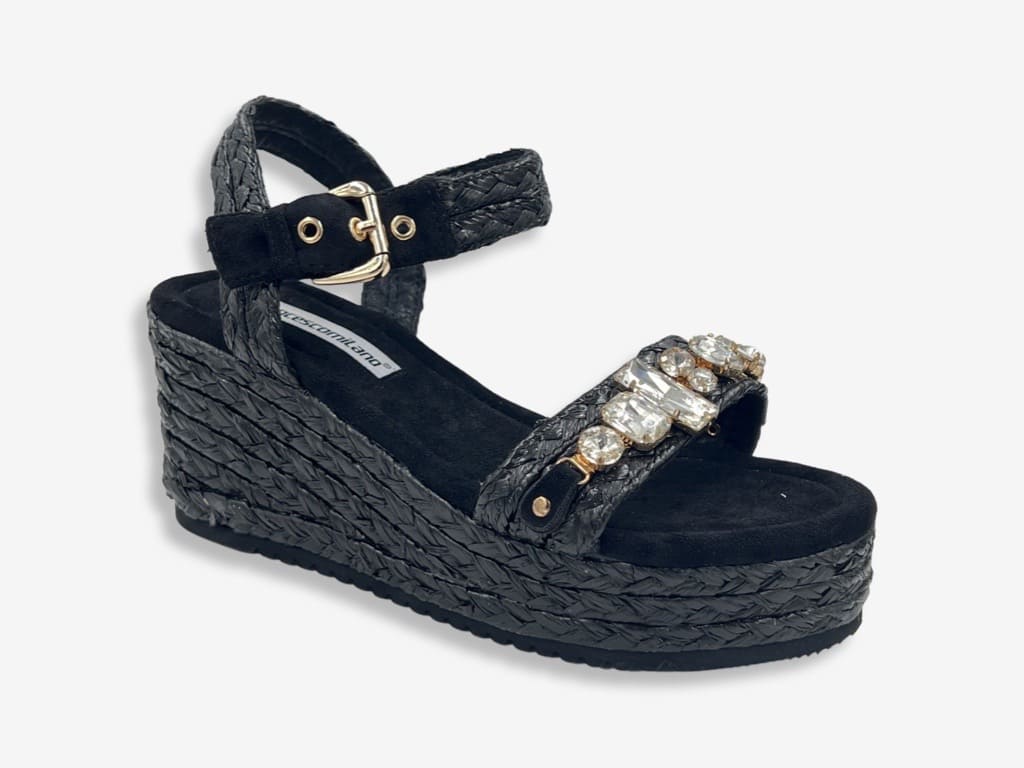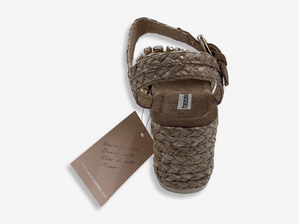 Francesco Milano V27-1T, sandalo da donna della nuova collezione 2022 Francesco Milano V27-1T. Un sandalo casual e sportivo realizzata con tomaia in tessuto e zeppa in rafia impreziosita da pietre di diversa dimensione . Zeppa 6,9 cm con plateau 2,5 cm. Un sandalo ideale per la stagione estiva di qualsiasi donna che ama uno stile casual e contemporaneo.