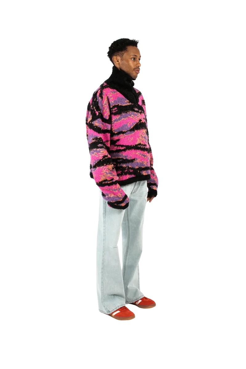 Il capo di maglieria oversize presenta audaci motivi astratti in modo prominente. Il design รจ ampio, offrendo una silhouette confortevole e rilassata. Ha maniche lunghe e un colletto alto e accogliente che aggiunge calore e stile. Abbinato nelle immagini con jeans azzurri e scarpe arancioni vivaci, questo maglione fa una dichiarazione di stile.