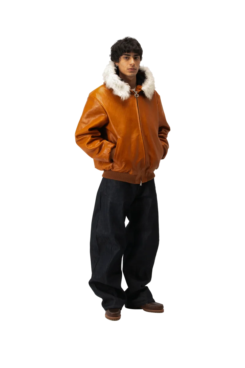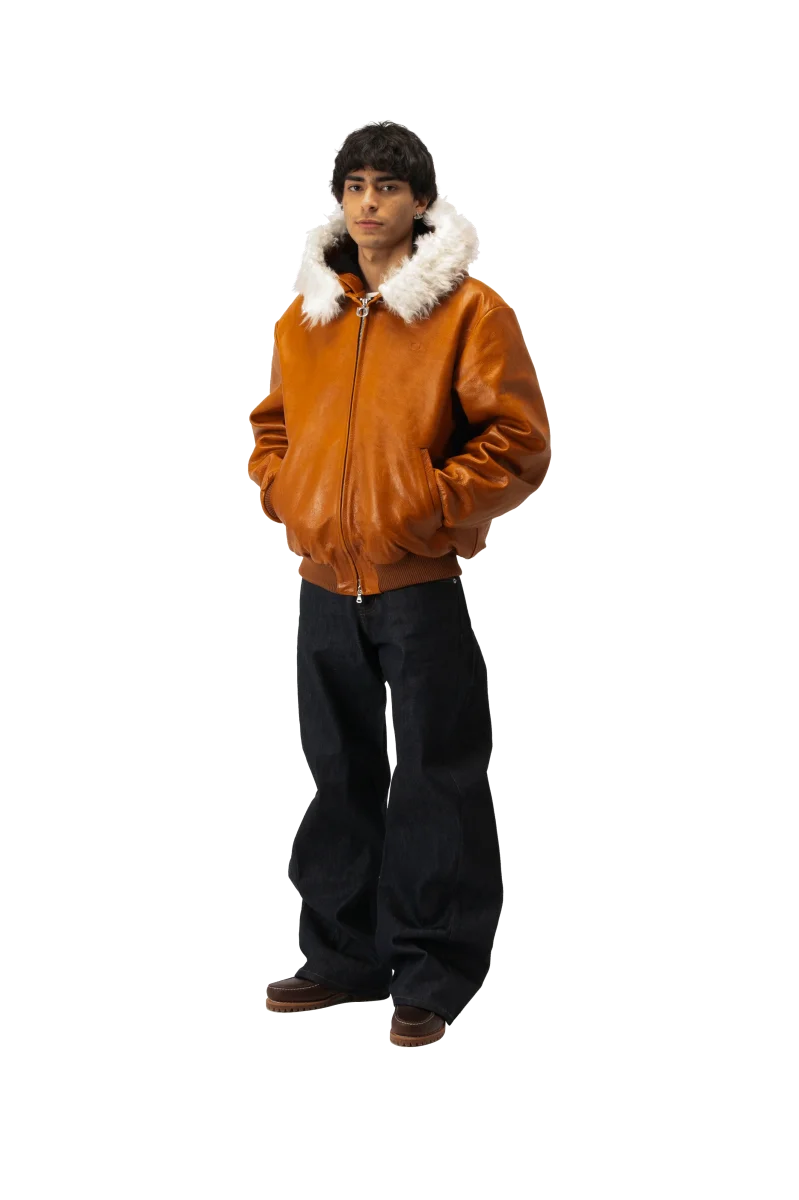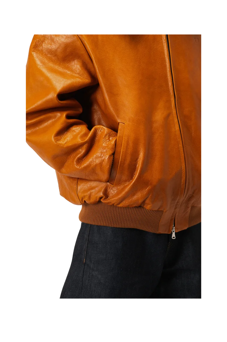 Questo bomber in pelle pull-up, realizzato in Italia con materiali di alta qualitร , presenta un aspetto naturale e vissuto che si evolve con lโutilizzo. Offre una vestibilitร regolare ed รจ dotato di imbottitura interna e chiusura con zip frontale.