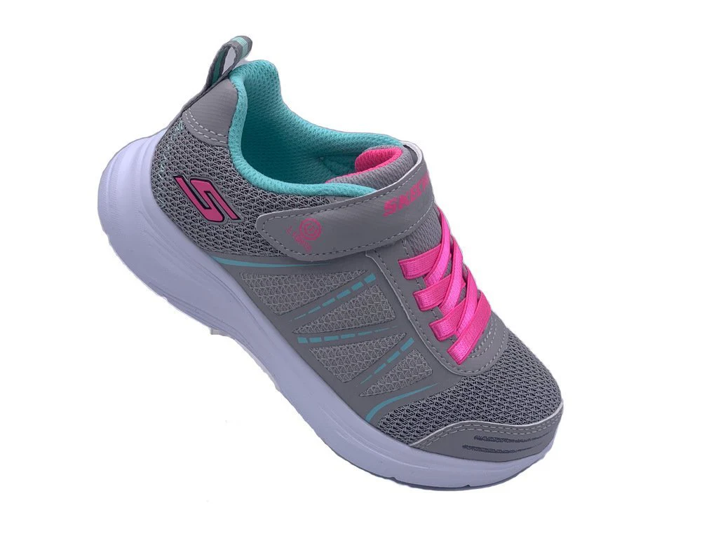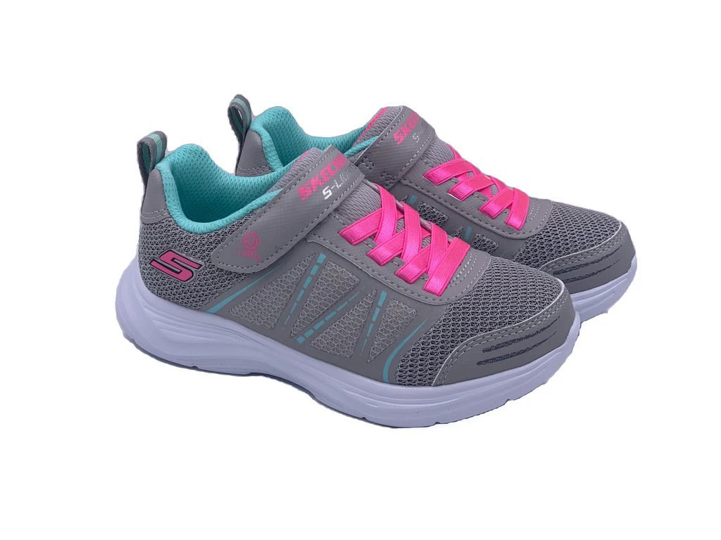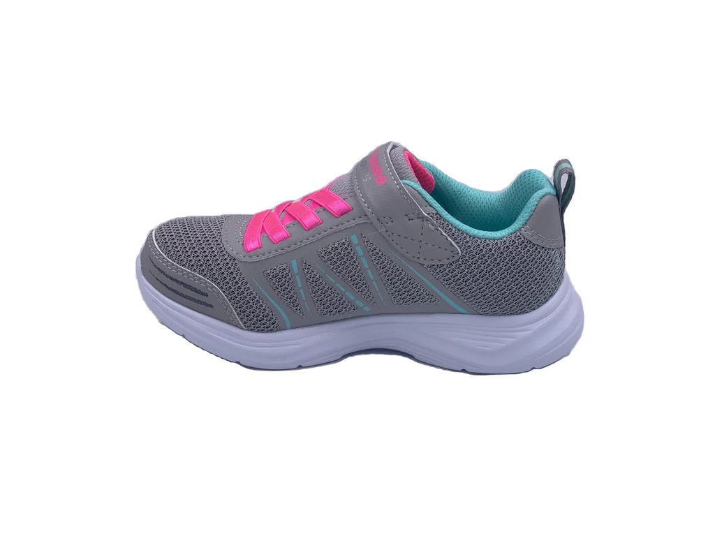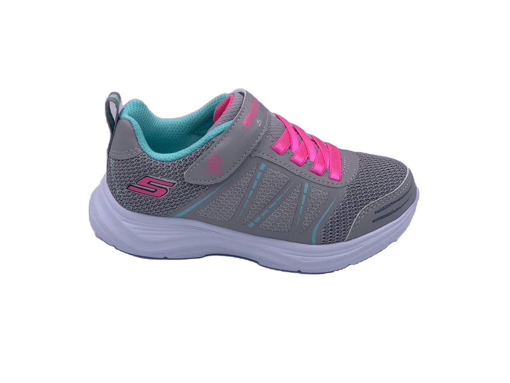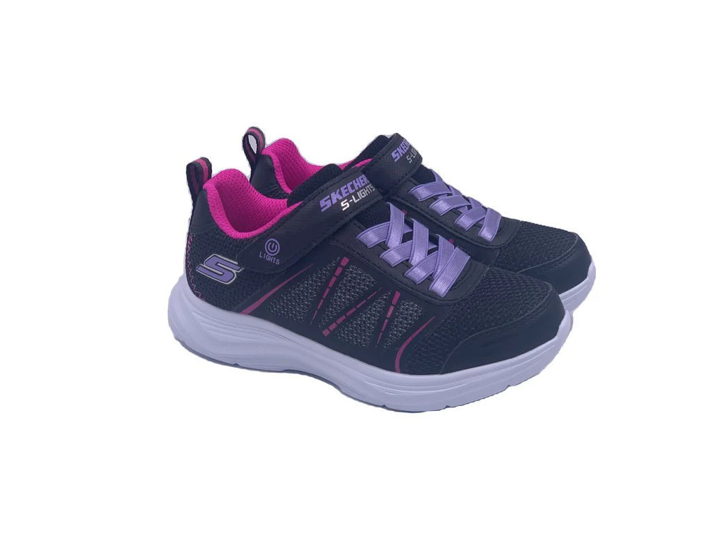 Skechers Shimmy Brights della linea S Lights. Una scarpa in tessuto ed ecopelle da bambina dotata di suola in memory foam, scarpa comoda e leggera , dalle linee morbide e perfette per uno stile casual ed adatto a tutti i giorni. Ideale per le giornate dei piรน piccoli.Dotata di Led interni ad accensione manuale. Chiusura a strappo e con laccio elasticizzato