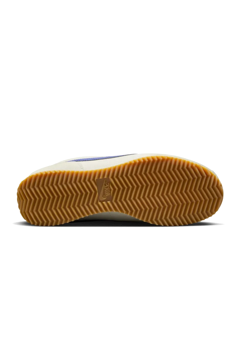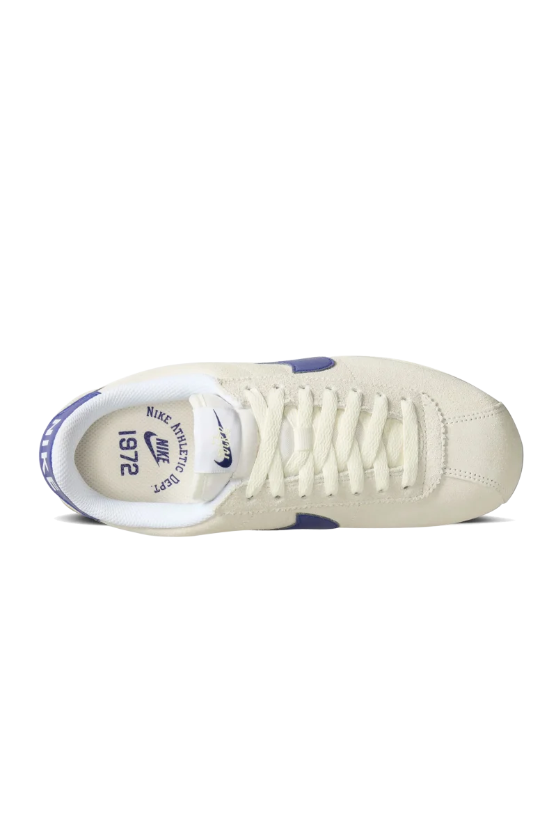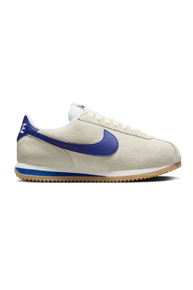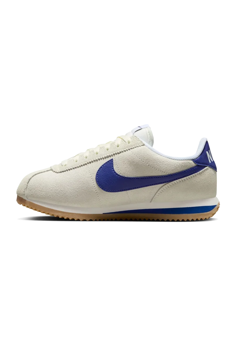 La prima Nike Cortez della collezione รจ caratterizzata da una morbida pelle scamosciata color “Pale Ivory”, accentuata da tocchi di “Deep Royal Blue”. Questi dettagli accattivanti si trovano sullo Swoosh, sulla sovrapposizione del tallone, sulla linguetta, sul marchio della soletta e sulla fascia del tallone. Completa il look la classica suola in gomma.