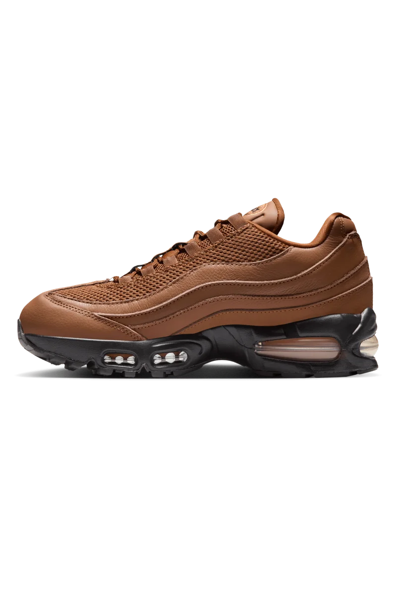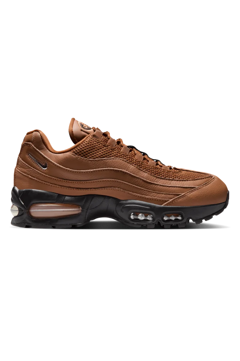 La pelle marrone chiaro avvolge i pannelli ondulati, cambiando leggermente tonalitร man mano che si sposta verso la parte centrale del piede. La rete sulla punta e sulla linguetta garantisce traspirabilitร e texture. Lo Swoosh Jewel รจ posizionato discretamente vicino al tallone e cattura la luce solo quando lo si nota. L’intersuola nera sottostante conferisce peso all’intera scarpa.