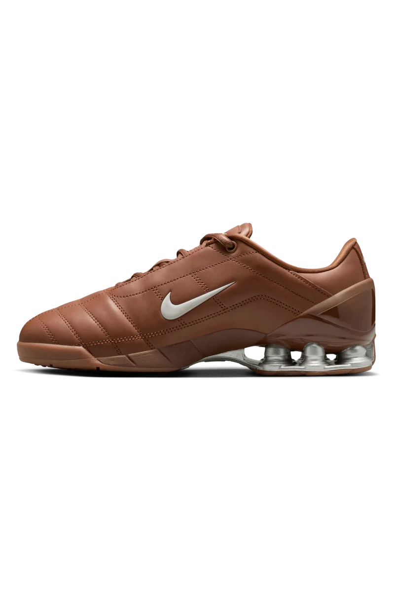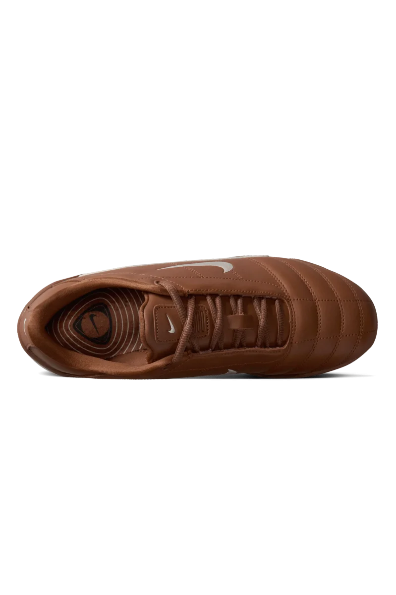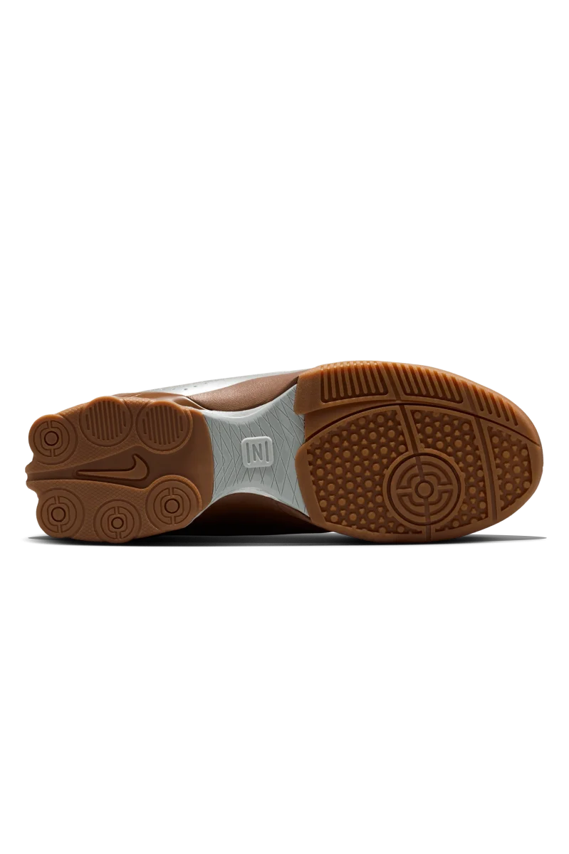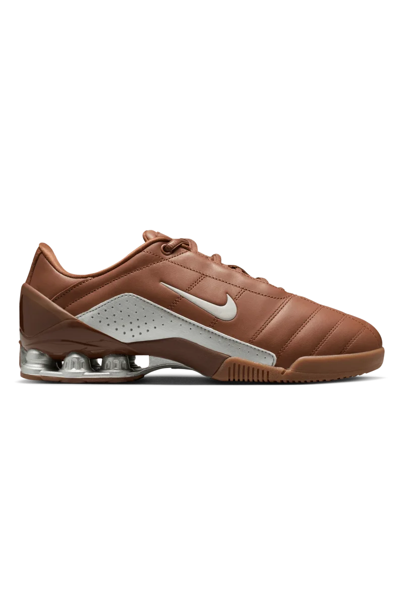 Le Nike Total 90 Shox Magia “Pecan” sono una versione raffinata delle scarpe da calcio Nike dei primi anni 2000. Combinando la tradizione delle prestazioni con il fascino dello stile di vita, questa colorazione Total 90 sfoggia una ricca palette di marroni accentuata da toni metallici. La pelle liscia ricopre la tomaia in tonalitร pecan stratificate, mentre l’avampiede trapuntato ricorda il classico design delle scarpe da calcio indoor. Nel frattempo, lo Swoosh metallico argento aggiunge un contrasto che mantiene il look nitido ed equilibrato. Sotto il piede, l’ammortizzazione Shox a vista definisce l’identitร della silhouette. Le colonne argentate aggiungono struttura e profonditร visiva, mentre la suola in gomma garantisce trazione e calore.